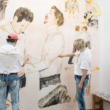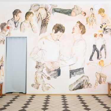 In 2009, the phrase "Art is too serious of a matter to be left to artists who no longer dare to make mistakes" was painted on the wall. Now a large mural is displayed at the end of the room. It is a collage of images, different events and activities performed by two similar characters. They sit, sniff, talk, touch each other and so on.
