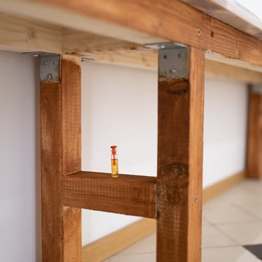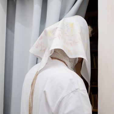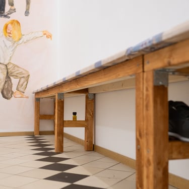 Benches covered with waxed tablecloth line the gallery space. They look too narrow and it feels serious to sit on them. The patterns and colours of the fabric are reminiscent of a 90's summer cottage interior or a weatherproof cover for a garden table. Fifteen years ago, there was a desk and a stack of books in the room, a floor-to-ceiling chalkboard leaned against the wall. This room has a calm, distracted atmosphere – as if time moves at a different rhythm than outside.